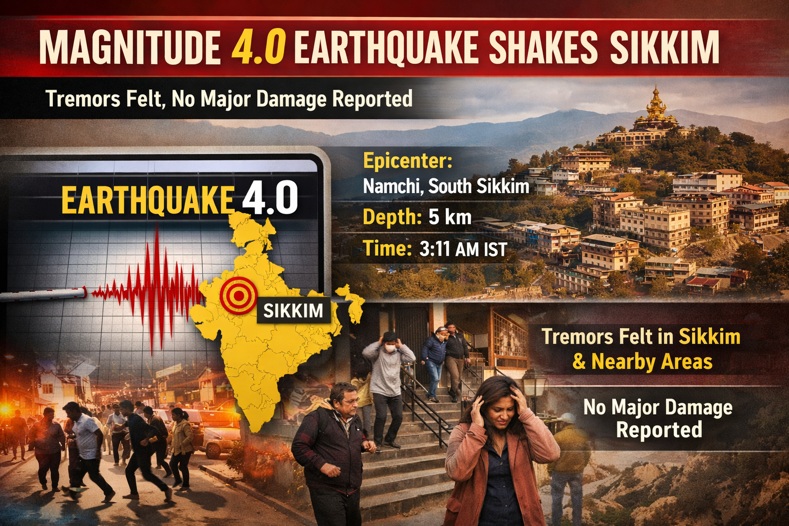 A mild earthquake measuring around magnitude 4.0 struck parts of Sikkim, sending brief tremors across several nearby areas and prompting residents to step outdoors as a precaution. According to preliminary seismic readings, the quake occurred at a shallow depth, which made the shaking noticeable despite its moderate magnitude. The tremors were felt in multiple districts, especially in hilly regions where seismic sensitivity is generally higher.