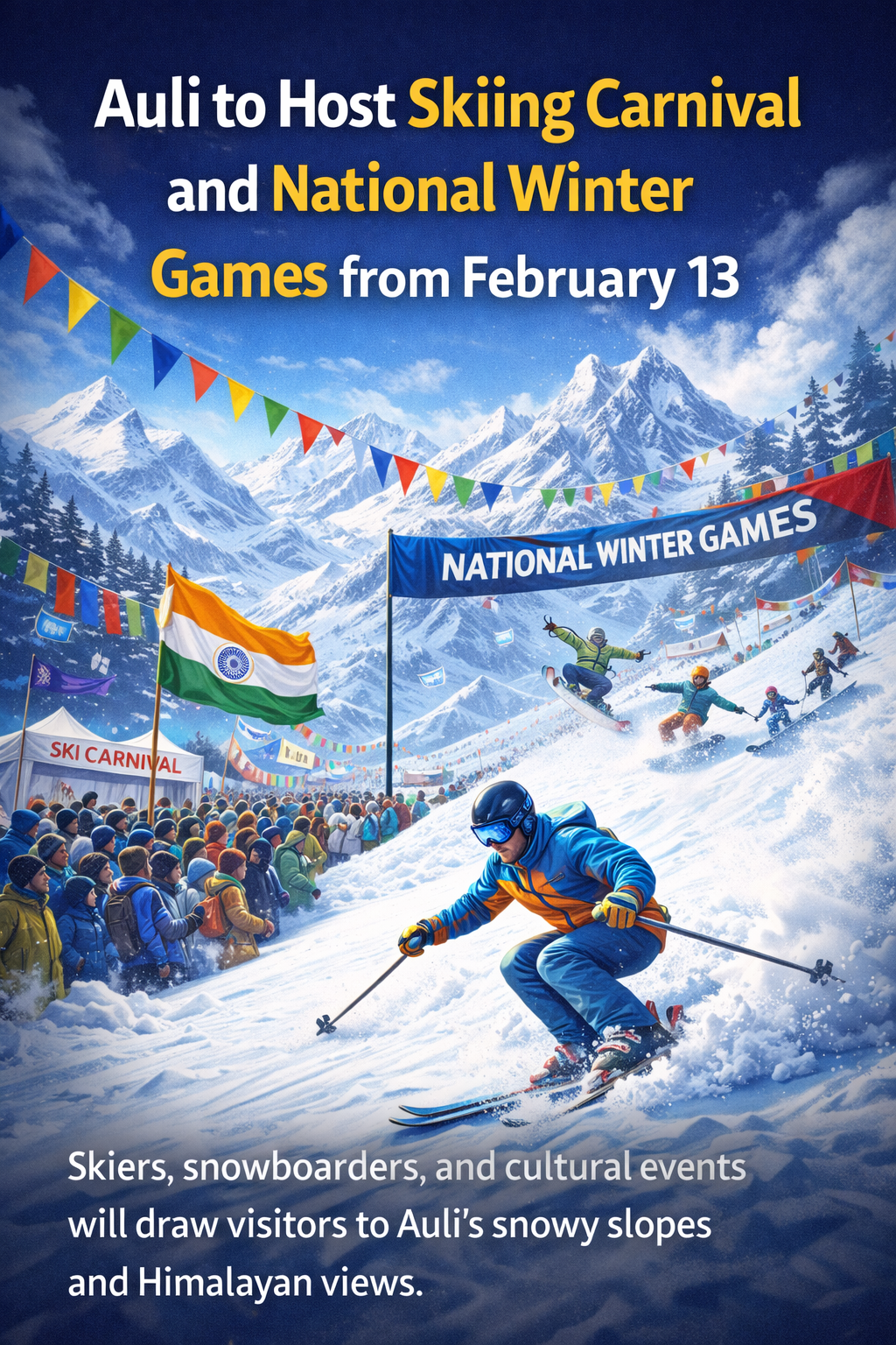 Auli, one of India’s premier winter sports destinations in Uttarakhand, is set to host a grand skiing carnival along with the National Winter Games starting February 13, drawing athletes, adventure enthusiasts, and tourists from across the country. Known for its snow-covered slopes and panoramic Himalayan views, Auli is once again preparing to showcase its world-class winter sports infrastructure and natural beauty.