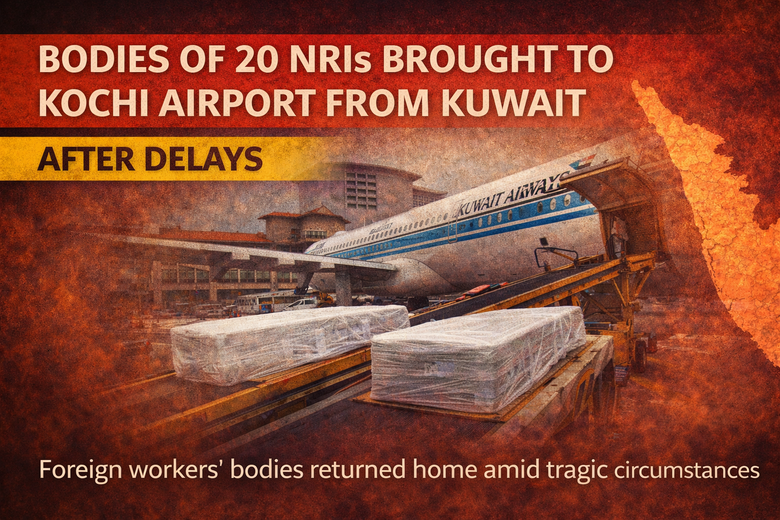 A somber scene unfolded at Cochin International Airport as the bodies of 20 non-resident Indians (NRIs) were brought from Kuwait after facing delays. The arrival marked an emotional moment for families and relatives who had been waiting for the return of their loved ones.