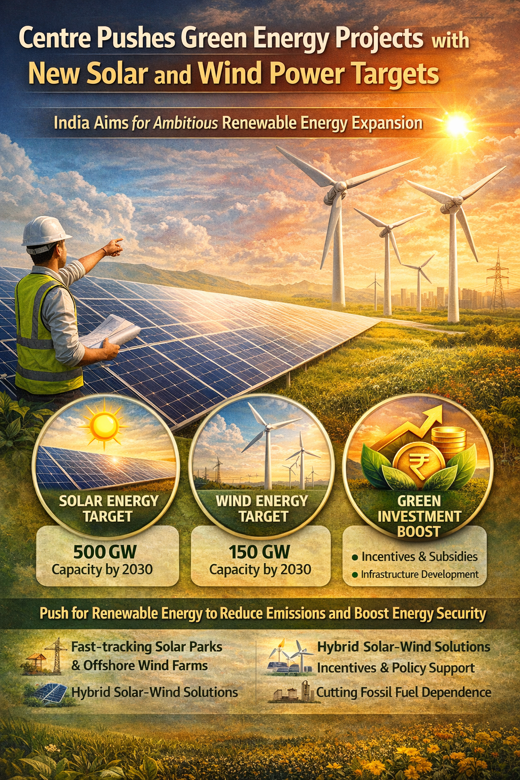 The central government has intensified its focus on renewable energy by announcing ambitious new targets for solar and wind power development across the country. As part of its long-term sustainability strategy, India aims to significantly increase its clean energy capacity, reduce dependence on fossil fuels, and move closer to its climate commitments under global agreements. The latest push includes accelerated approvals for large-scale solar parks, offshore wind projects, and incentives for private sector participation.