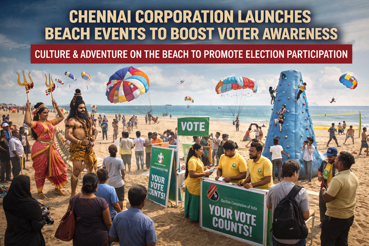 The initiative is being organized across popular beaches in Chennai, including the well-known Marina Beach and Elliot’s Beach. The events feature cultural performances, beach sports, adventure games, and interactive programs aimed at engaging young voters and families.
