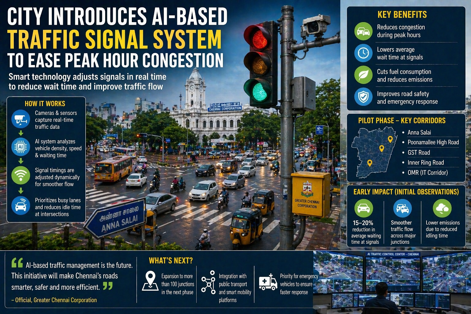 In a major step toward smarter urban mobility, Chennai has introduced an AI-based traffic signal system aimed at reducing peak-hour congestion across key junctions in the city.