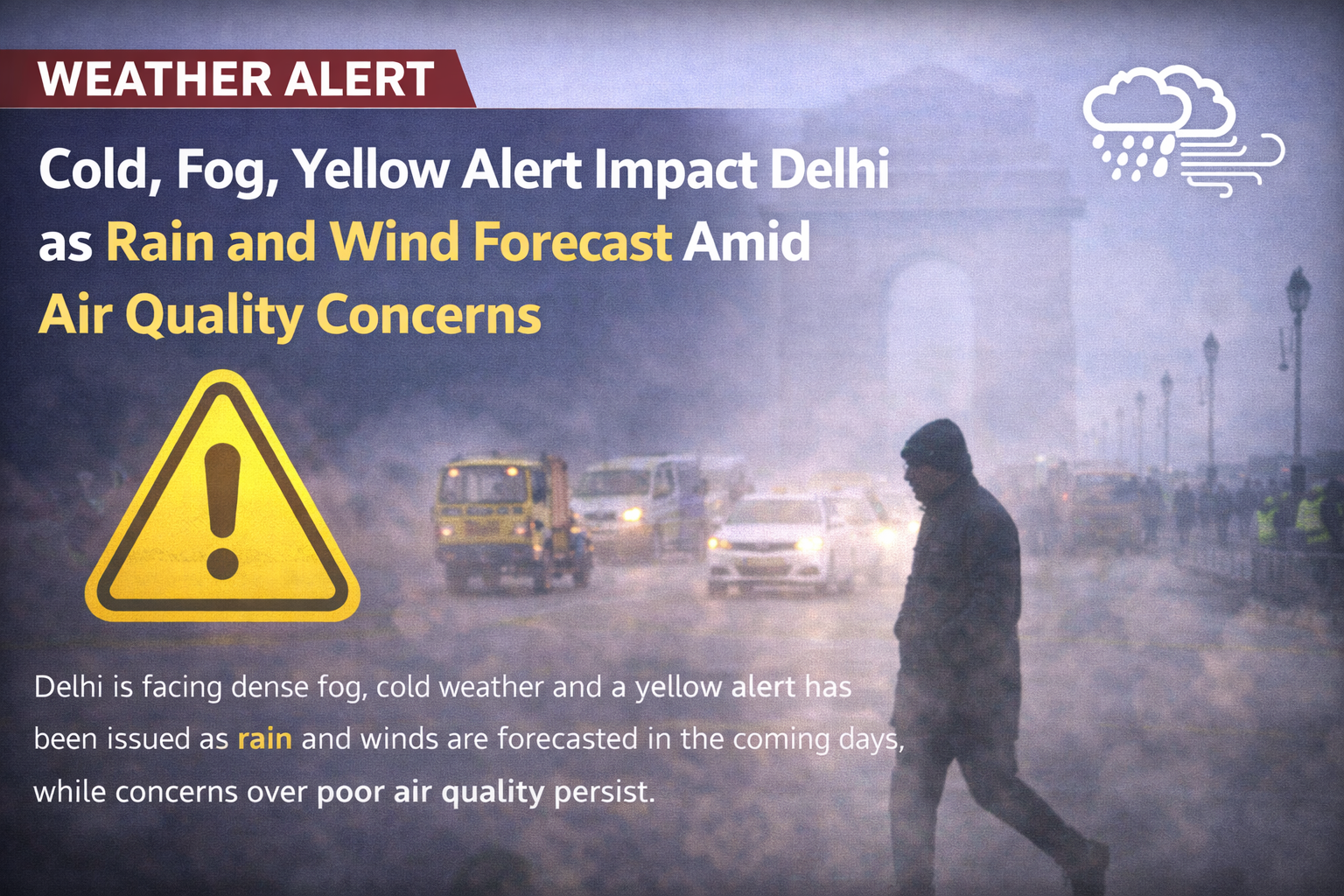 Delhi is experiencing a spell of cold weather and dense fog conditions, with authorities issuing a yellow weather alert as forecasts indicate the likelihood of light rain and gusty winds over the coming days. The changing weather pattern has affected visibility levels across several parts of the city, leading to slower traffic movement and precautionary advisories for commuters and transport operators.