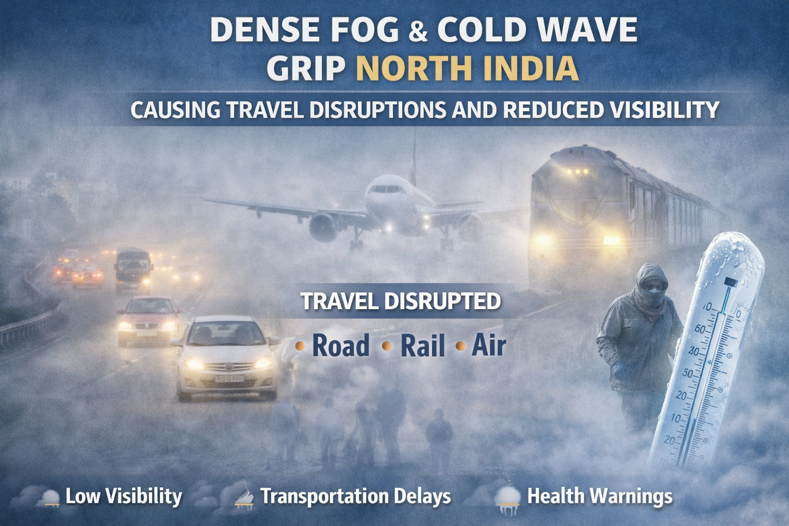 Large parts of North India continue to reel under dense fog and an intense cold wave, significantly disrupting daily life and transportation across the region. Major cities including Delhi, Chandigarh, Lucknow, Jaipur, and parts of Punjab, Haryana, and Uttar Pradesh have reported severely reduced visibility during early morning and late-night hours, leading to delays and cancellations in road, rail, and air travel.