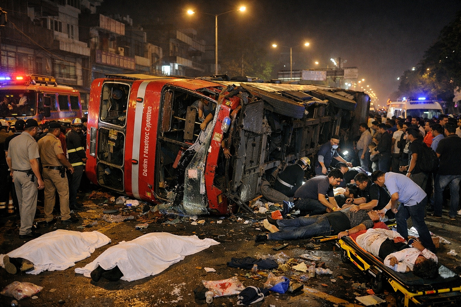 A tragic road accident in Karol Bagh has left at least two people dead and more than 20 others injured after a double-decker bus overturned during late-night travel. The incident occurred in the busy central district of New Delhi, raising serious concerns about road safety and vehicle management in the capital.
