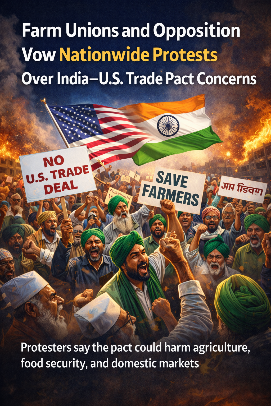 Farm unions and several opposition parties have announced plans for nationwide protests opposing the proposed India–U.S. trade pact, raising concerns about its potential impact on agriculture, food security, and domestic markets. According to union leaders, key provisions under discussion could increase imports of agricultural products, weaken minimum support price (MSP) protections, and expose small and marginal farmers to unfair global competition.