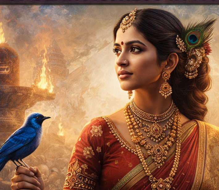 In the poster, Nabha Natesh is revealed as Parvathi — a character marked by both elegance and spiritual depth. She appears draped in a traditional silk saree, adorned with intricate jewellery and poised with serene grace, evoking imagery rooted in mythological and cultural symbolism. The visual is enriched with a vibrant blue bird and a peacock alongside a backdrop featuring a temple, further deepening the poster’s aura of mysticism and cultural resonance.