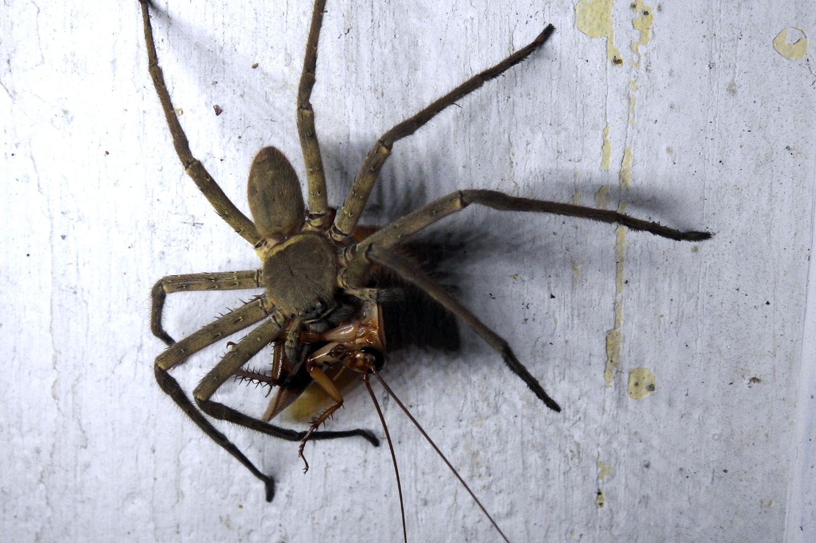 A remarkable scene often observed is its method of feeding: it swiftly captures a cockroach, begins feeding—sometimes starting at the head—and then secures the prey to a surface using silk. This allows the spider to return later and consume the rest at its own pace.