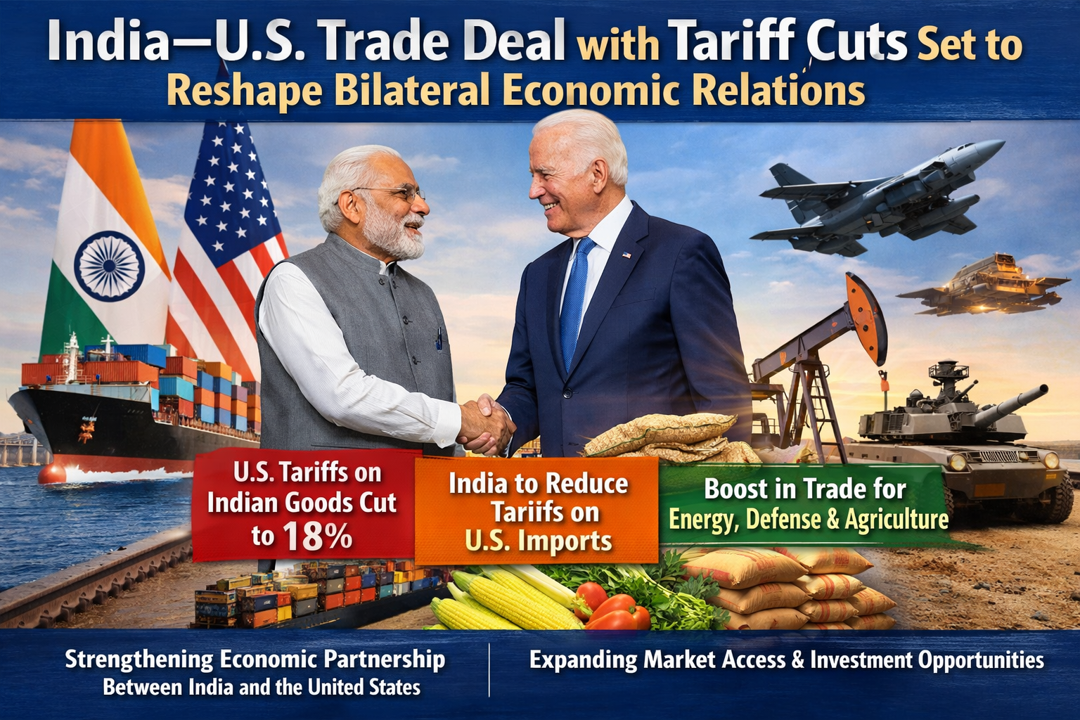 The India–United States trade deal announced in early February 2026 marks a major reset in economic relations between the two democracies, as both nations agree to ease long-standing tariff tensions and deepen cooperation across key sectors. Under the agreement, the United States will reduce reciprocal tariffs on Indian goods from previously high rates to around 18 percent, while India has agreed to cut tariffs on American imports and expand purchases of U.S. products including energy, defence equipment, and agricultural goods — a move that New Delhi expects will foster stronger market access for U.S. exporters.