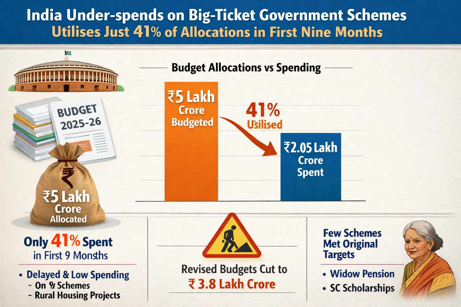 India’s spending on several major government schemes has reached only about 41% of the allocated budget so far this financial cycle, raising concerns about execution delays and implementation bottlenecks. Big-ticket programs across infrastructure, rural development, urban upgrades, and social welfare are reportedly lagging behind planned expenditure targets despite substantial budgetary provisions.