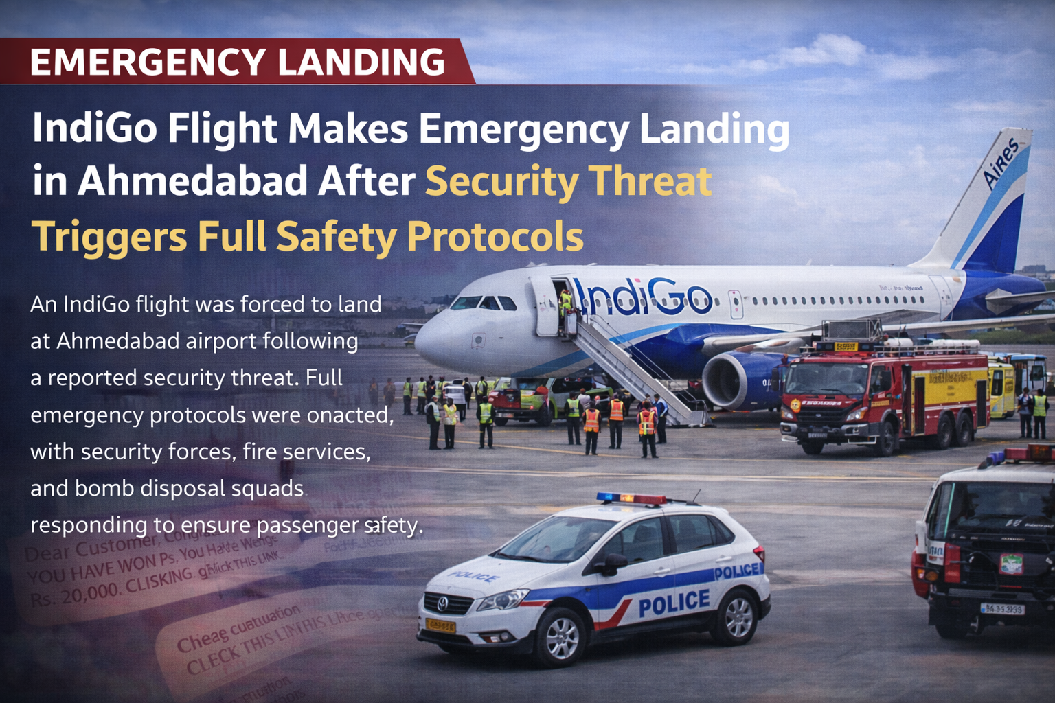 An IndiGo flight was forced to make an emergency landing at Ahmedabad airport after a reported security threat prompted authorities to activate full safety and emergency response protocols. The aircraft, which was operating a scheduled domestic route, was diverted as a precautionary measure following receipt of the alert during the course of the journey.