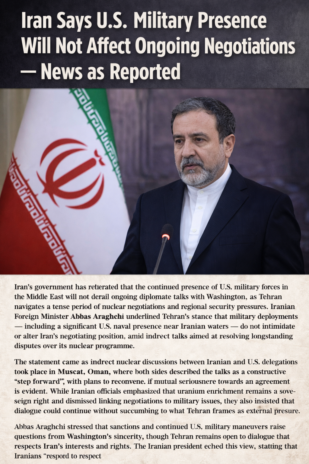 Iran’s government has reiterated that the continued presence of U.S. military forces in the Middle East will not derail ongoing diplomatic talks with Washington, as Tehran navigates a tense period of nuclear negotiations and regional security pressures. Iranian Foreign Minister Abbas Araghchi underlined Tehran’s stance that military deployments — including a significant U.S. naval presence near Iranian waters — do not intimidate or alter Iran’s negotiating position, amid indirect talks aimed at resolving longstanding disputes over its nuclear programme.