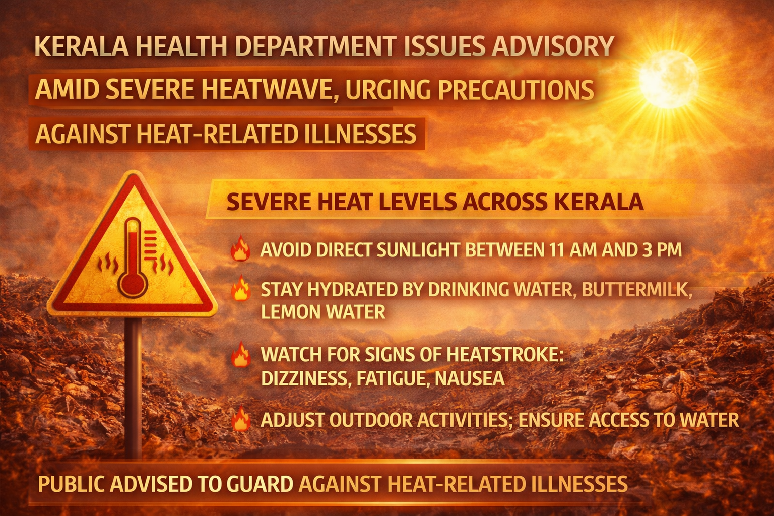 Kerala is currently experiencing intense heatwave conditions, prompting the state health department to issue an urgent public advisory to safeguard residents from heat-related illnesses. With temperatures rising above normal levels and humidity adding to discomfort, authorities have emphasized the need for immediate preventive measures.