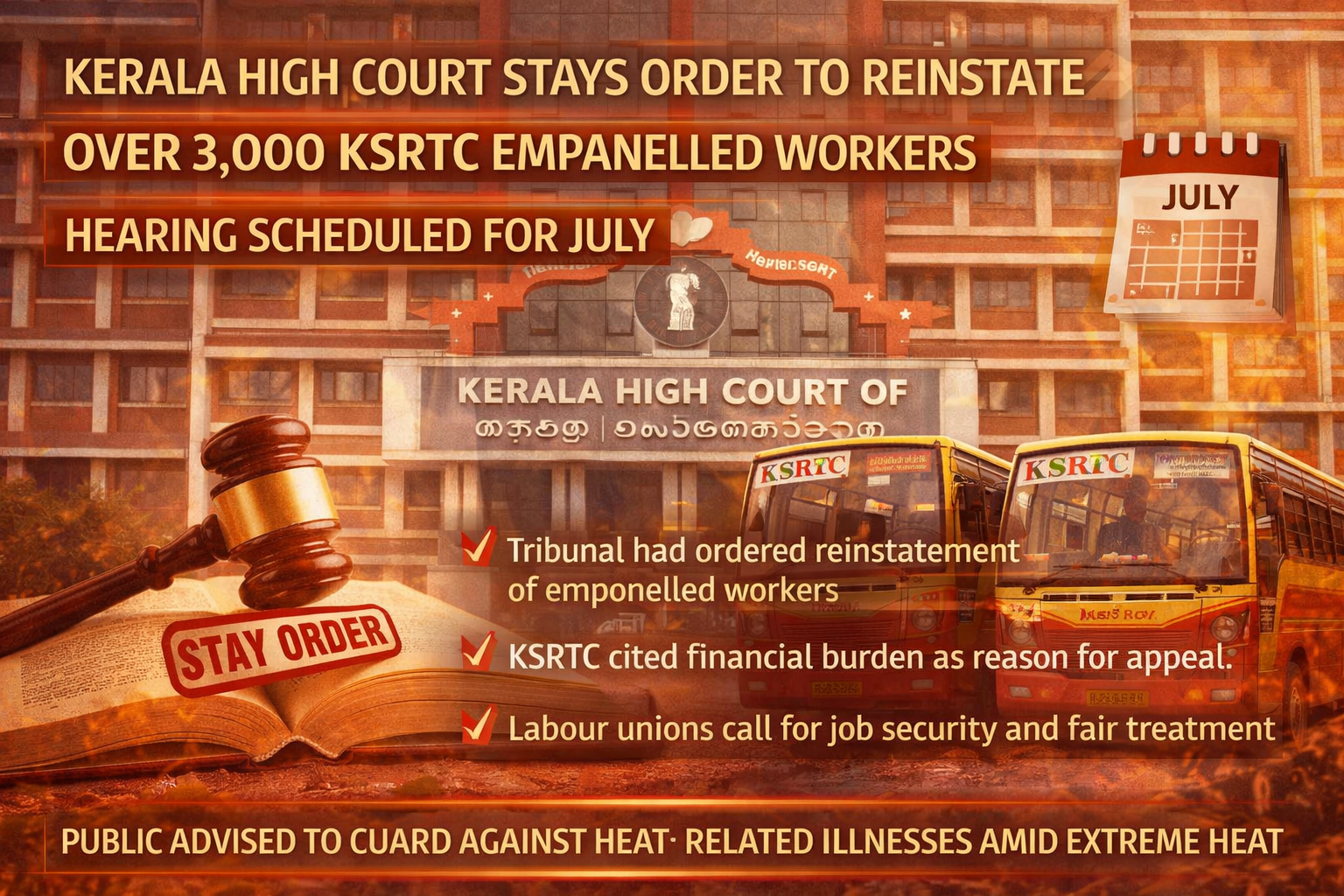 The Kerala High Court has stayed a tribunal order that directed the reinstatement of more than 3,000 empanelled workers of the Kerala State Road Transport Corporation (KSRTC). The court has scheduled the next hearing in the case for July, providing temporary relief to the state transport corporation.