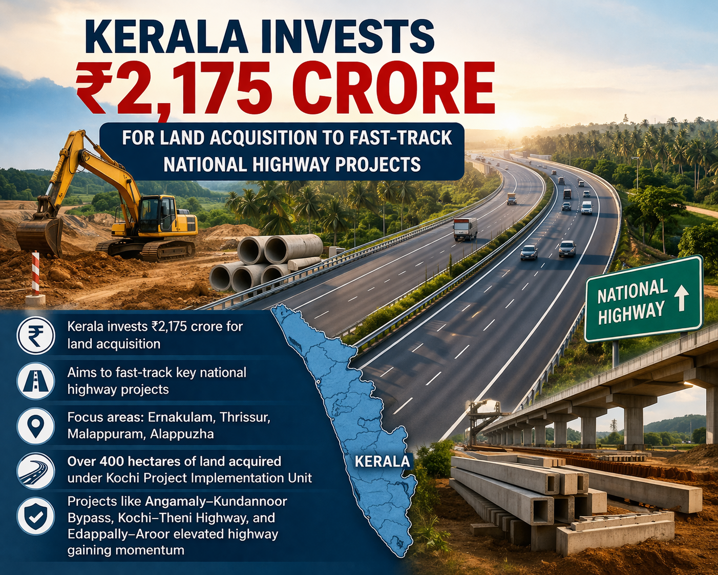 Kerala has taken a significant step toward accelerating infrastructure development by investing ₹2,175 crore in land acquisition for national highway projects across the state. This move is aimed at speeding up the execution of key highway expansions and improving overall connectivity, especially in central Kerala regions such as Ernakulam, Thrissur, Malappuram, and Alappuzha.
