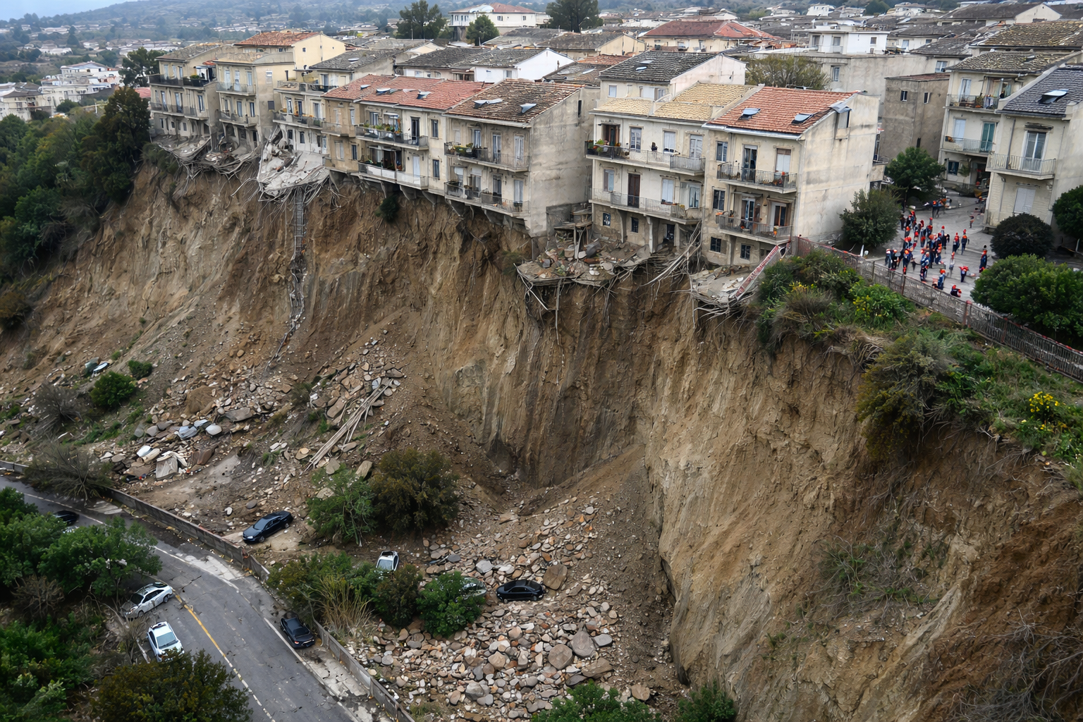 Italian civil protection authorities established a 150-metre “no-go zone” around the unstable area after drone and aerial images showed cars and structures that had slipped 20 metres down the newly formed precipice while other houses remain dangerously close to the edge. Civil protection chief Fabio Ciciliano warned that parts of the town were now uninhabitable and that many residents would need permanent relocation as ground movement persists.