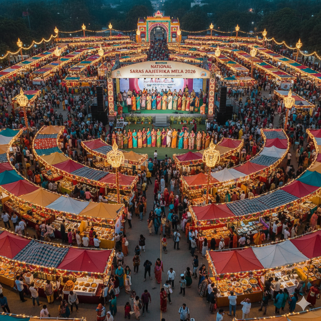 The National SARAS Aajeevika Mela 2026 has opened as a vibrant celebration of rural creativity, traditional crafts, and women-led entrepreneurship from across India. Organized with support from the Ministry of Rural Development, the mela brings together self-help groups, artisans, and small producers to display and sell a wide range of handmade and value-added products on a national platform.