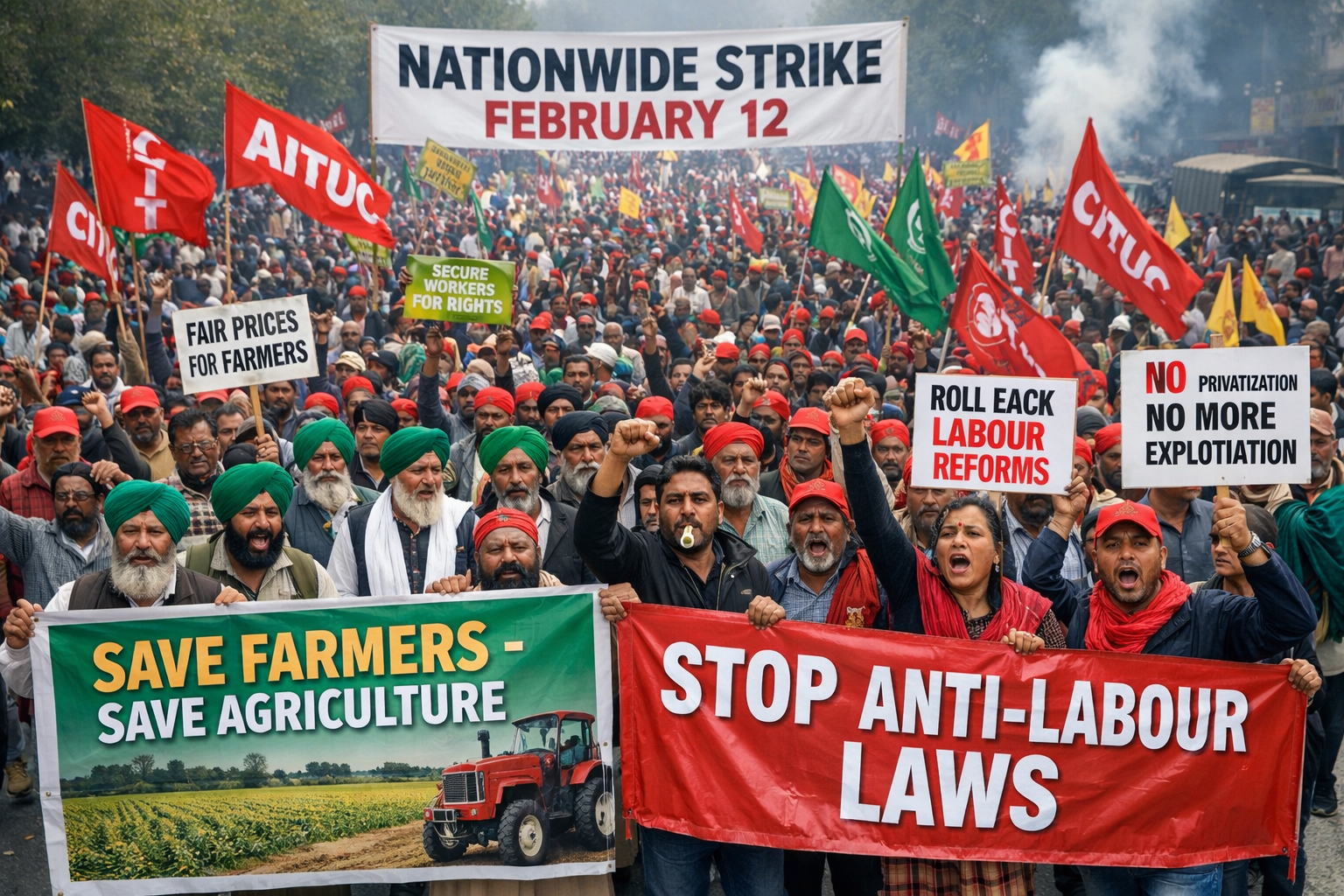 A nationwide strike has been called for February 12 by a coalition of trade unions and farmers’ organizations to protest against current labour reforms and agricultural policies. The protest is expected to see participation from workers across public and private sectors, along with farmer groups from multiple states, making it one of the largest coordinated actions in recent months. Organizers say the strike aims to highlight concerns over worker protections, wage security, privatization moves, and policy decisions affecting the agricultural community.