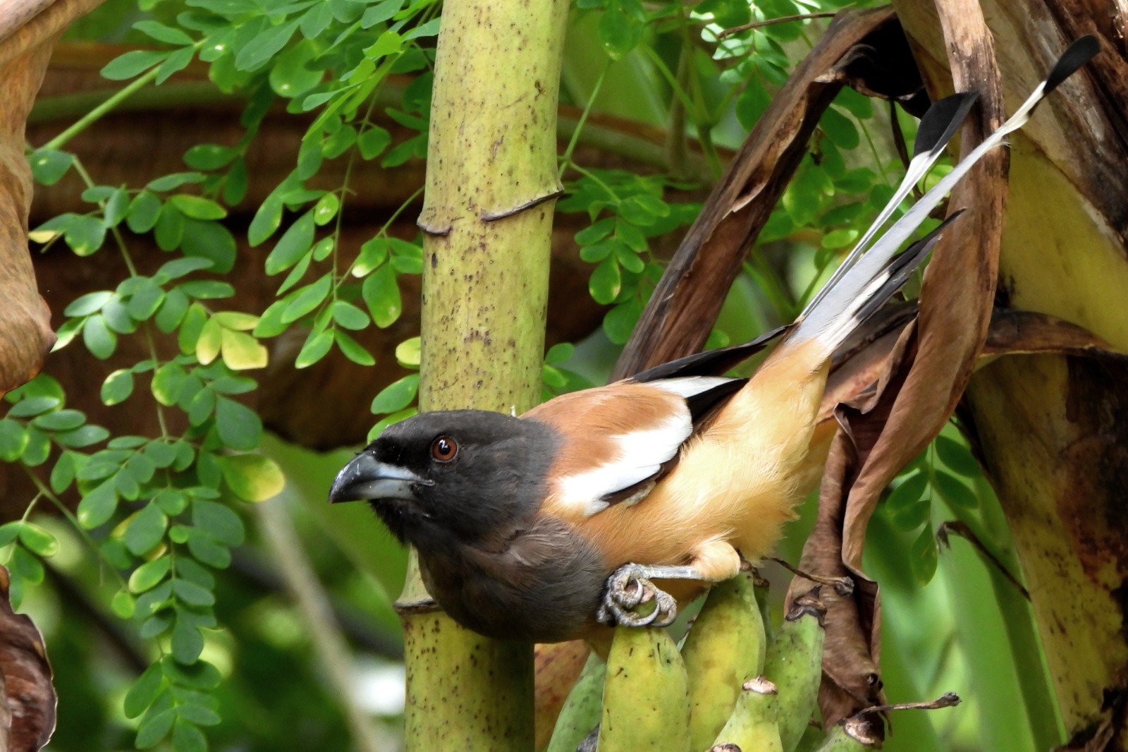 Beyond its distinctive appearance and vocal nature, the rufous treepie plays a crucial role in protecting palm trees. It feeds on the larvae of the destructive Red palm weevil, a pest known to cause significant damage to coconut and other palm species. By naturally controlling this pest, the bird contributes to maintaining the health of plantations and supporting local agriculture.