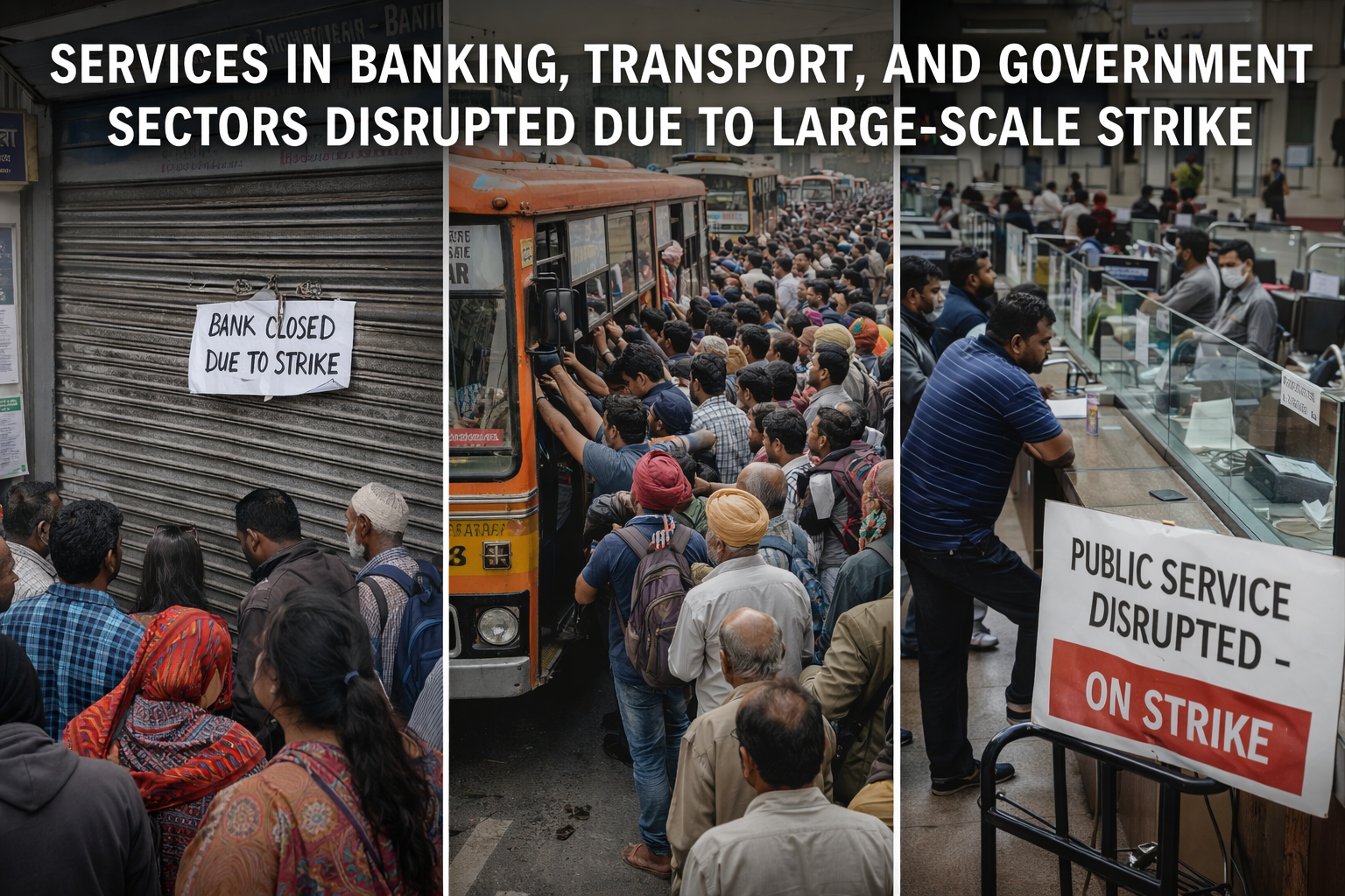 A large-scale nationwide strike has led to widespread disruptions across banking, transport, and government services, affecting daily life in multiple states. The coordinated protest, backed by major trade unions and farmer organizations, is aimed at opposing recent government policies on labour reforms, privatization, and agricultural issues. The impact varies by region, but several sectors have reported reduced operations and temporary shutdowns.