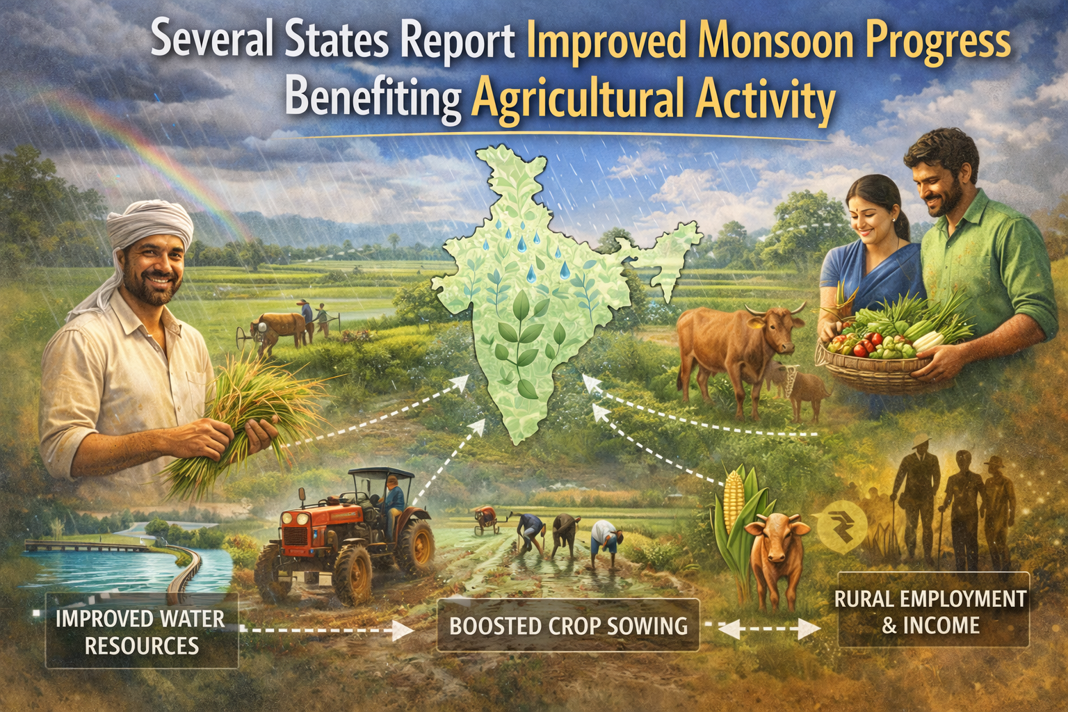 Several states across India have reported significant improvement in monsoon progress, bringing positive momentum to agricultural activity and rural livelihoods. Consistent and timely rainfall in many regions has supported early sowing operations, enhanced soil moisture, and improved water availability in reservoirs, canals, and ponds. The favourable weather conditions have boosted farmer confidence and set the stage for a strong agricultural season.
