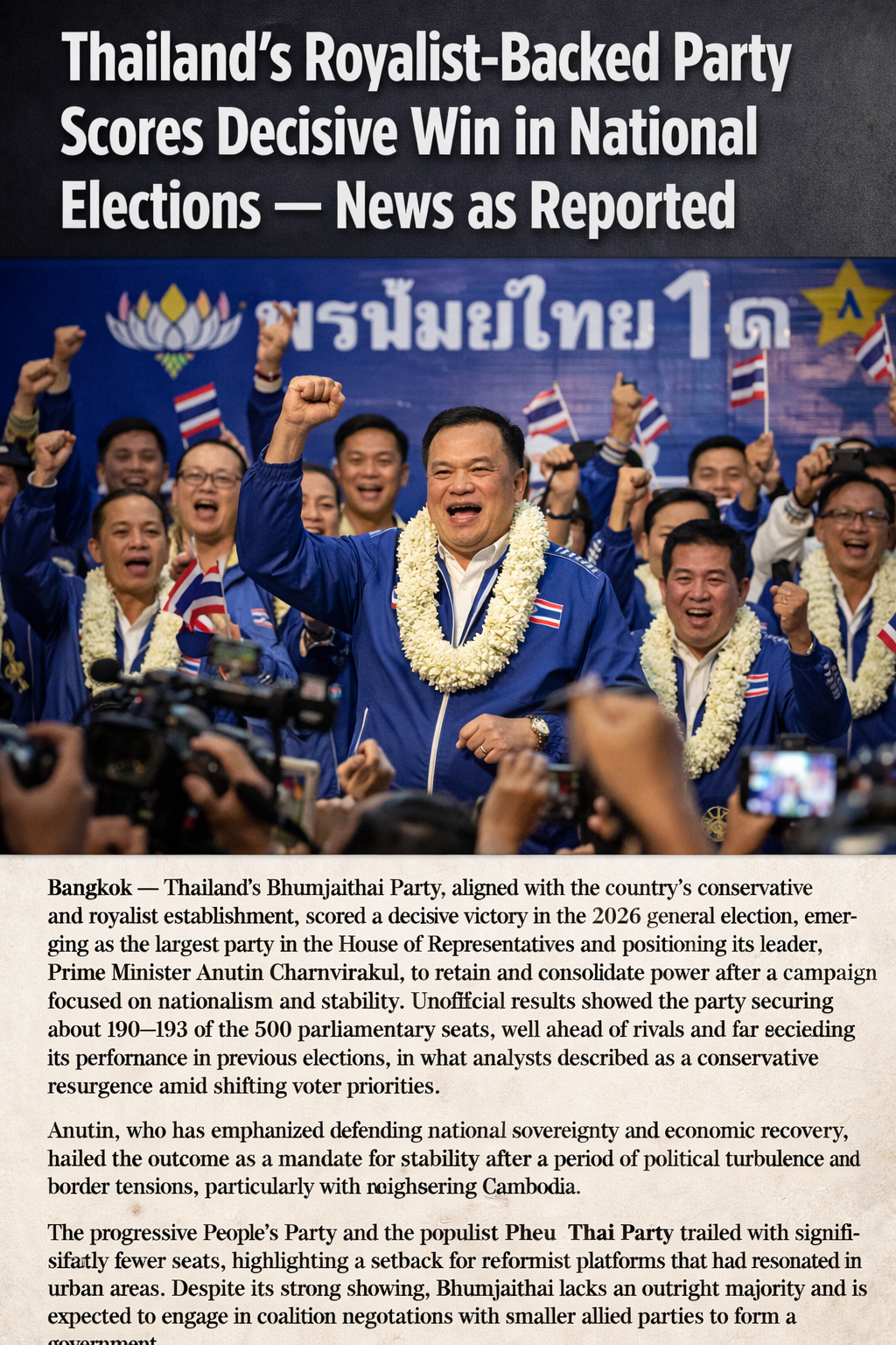 Bangkok — Thailand’s Bhumjaithai Party, aligned with the country’s conservative and royalist establishment, scored a decisive victory in the 2026 general election, emerging as the largest party in the House of Representatives and positioning its leader, Prime Minister Anutin Charnvirakul, to retain and consolidate power after a campaign focused on nationalism and stability. Unofficial results showed the party securing about 190–193 of the 500 parliamentary seats, well ahead of rivals and far exceeding its performance in previous elections, in what analysts described as a conservative resurgence amid shifting voter priorities.