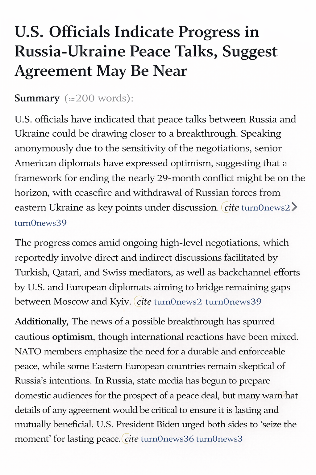 Senior U.S. officials have indicated that a potential peace agreement between Russia and Ukraine could be closer than at any point since the conflict began, raising cautious optimism amid continued diplomatic engagement. Speaking on condition of anonymity, officials said recent negotiations have shown “incremental progress,” with both sides maintaining channels of communication through intermediaries despite ongoing fighting on the ground.